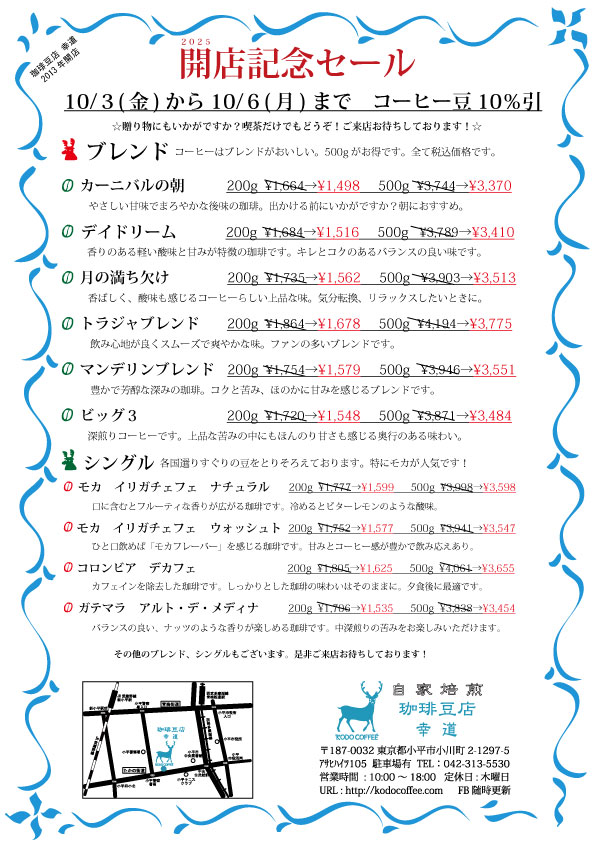 10/3(金)から10/6(月)までセールを行います by kodocoffee on 2025年10月1日 in お知らせ 暑さが段々と和らいできました。毎度お引き立てありがとうございます。タイトルの通り、毎年の恒例ではありますが、10/3-10/6まで開店記念セールを行います。コーヒー豆を通常価格から10%引で販売いたします。是非この機会にご来店ください。お待ちしております。 2025開店記念セール