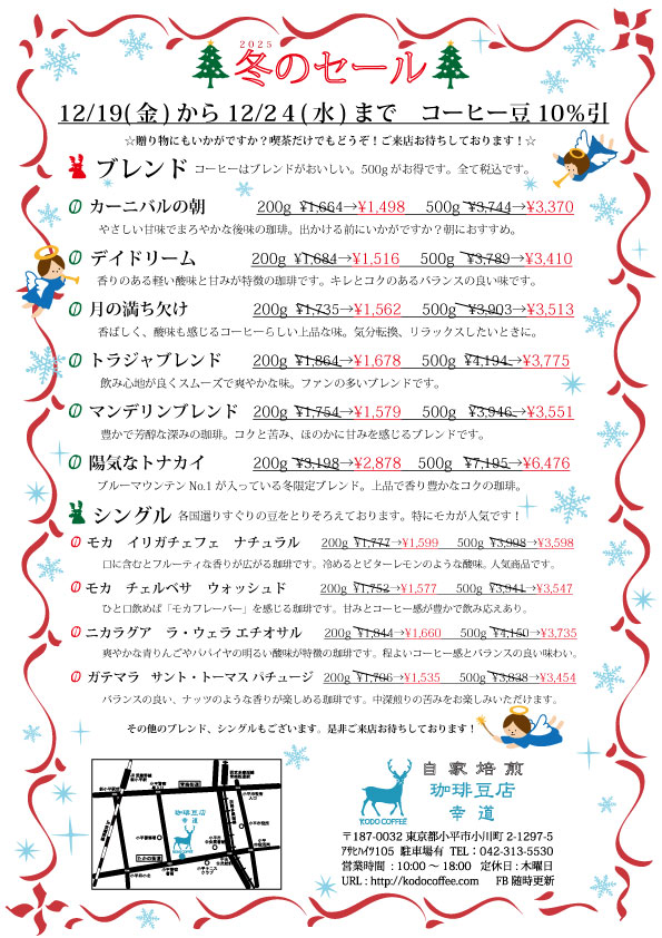 12/19(金)-24(水)まで冬のセールを行います。 by kodocoffee on 2025年12月17日 in お知らせ 毎年の恒例ではございますが、表題の通り12/19からコーヒー豆を10%引きで販売いたします。 冬季限定の人気ブレンドーコーヒー『陽気なトナカイ』も販売中です。 皆様のご来店を心からお待ちしております。