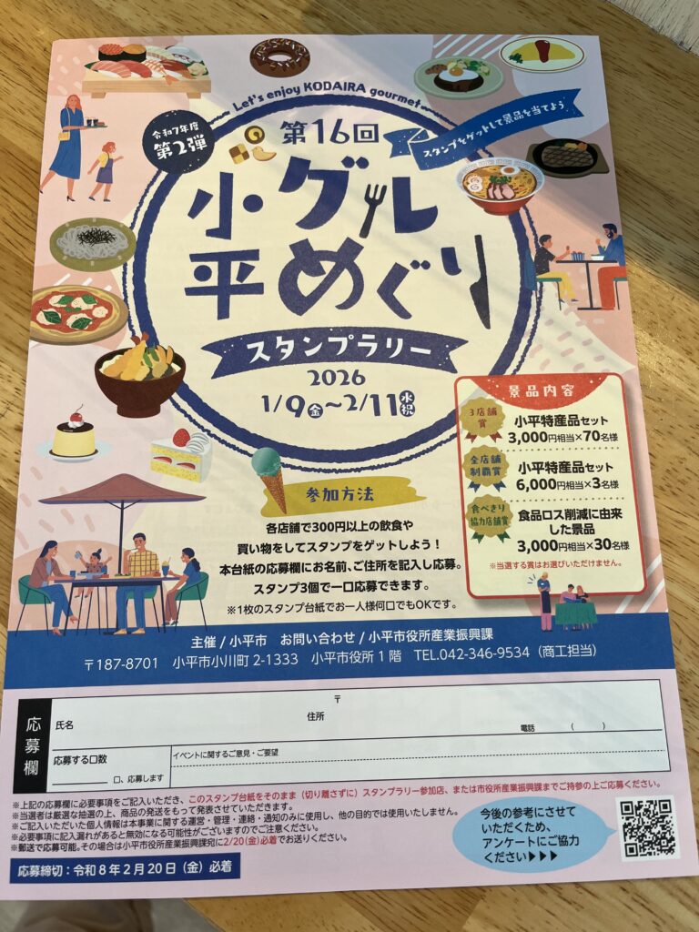小平グルめぐりスタンプラリー by kodocoffee on 2026年1月9日 in お知らせ 本日9日から小平グルめぐりスタンプラリーを開催いたします。各店舗で300円以上の飲食や買い物をしてスタンプをゲット。チラシ兼スタンプ台紙の応募券にお名前、ご住所を記入して応募すると、抽選で小平特産品セットなどが当たるイベントを実施します。ぜひご参加ください!台紙は当店で配布いたします。